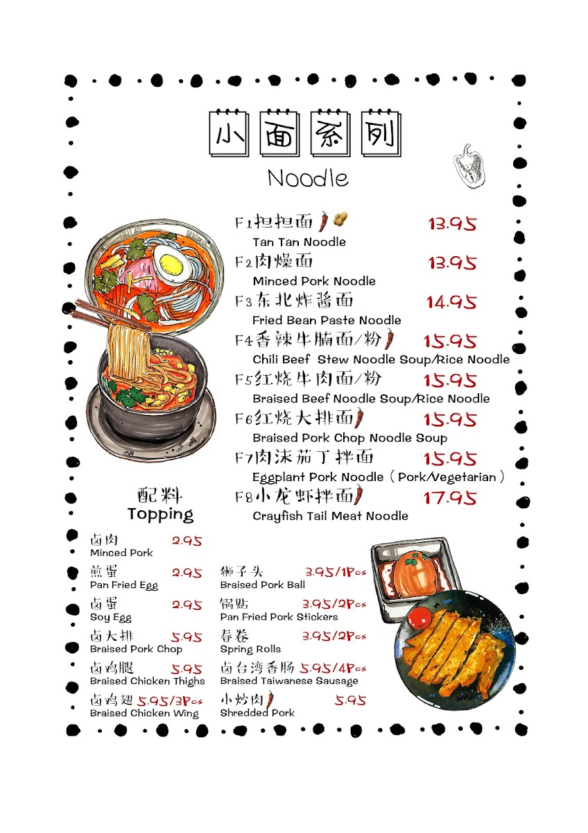 This menu is designed for casual dining occasions where customers may order quick meals or enjoy a more extended sit-down experience. It offers balanced options across spicy, savory, and lighter beverage categories.